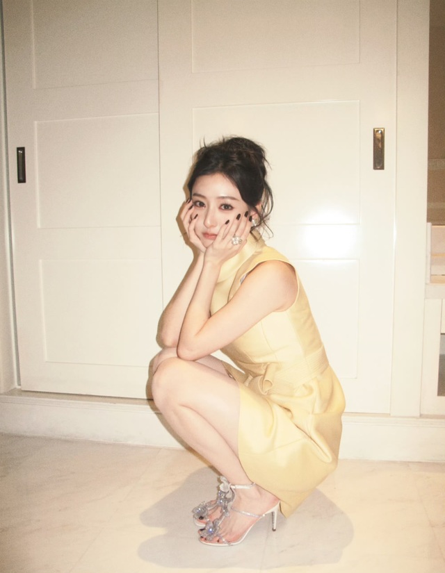 她身著一襲明黃色無袖連衣裙,剪裁利落卻不失柔美。裙擺垂墜自然,勾勒出優(yōu)雅的身形。