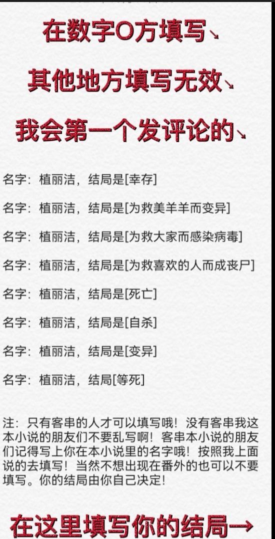 閔拾玖小潔什么?你問(wèn)我是什么類(lèi)型的番外?當(dāng)然是喪尸啦!番外喪尸小說(shuō)!可能會(huì)有些血腥,客串本小說(shuō)的人想?yún)⒓拥脑捲谙旅嬖u(píng)論哦!