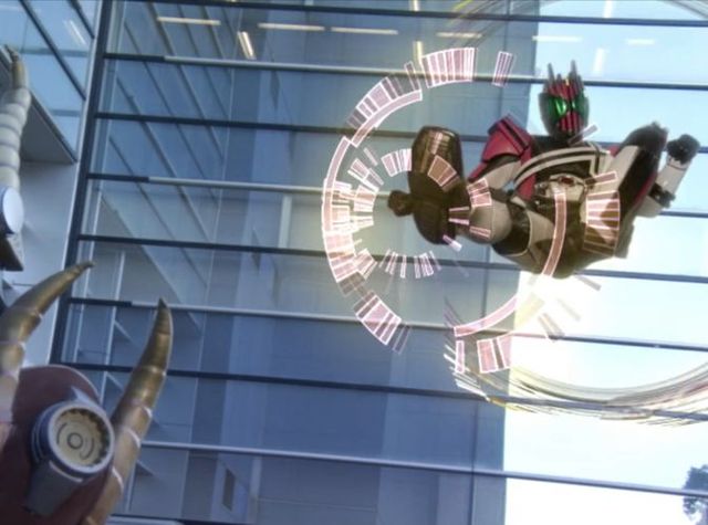 從卡統盒里 拿出絕招卡 把腰帶兩邊開關拉開 把絕招卡放進去兩邊開關一推 攻擊駕馭 帝帝帝帝騎 說完跳了上去瞬間形成了一個個卡片形狀直接穿過卡片形狀。踢到古朗基身上