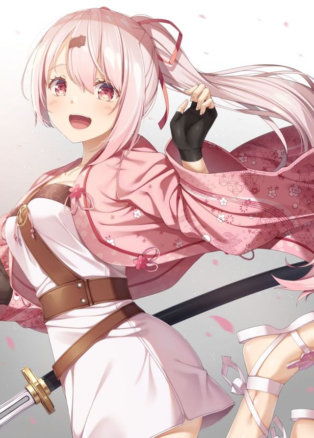 還未看見(jiàn)人,就聞到一陣花香,似是特意打扮過(guò)。抬頭看去,只見(jiàn)一個(gè)櫻白色單馬尾的女孩亭亭玉立,身著白色金邊里襯,胸口的山峰隱隱欲現(xiàn),外披粉白羽織,其上繡著櫻花圖案,腰間掛有一柄武士刀。