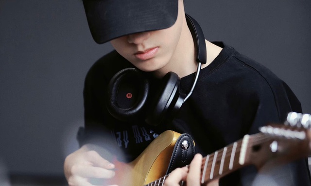 少年低頭擺弄著電吉他,鴨舌帽遮住了他大半邊臉