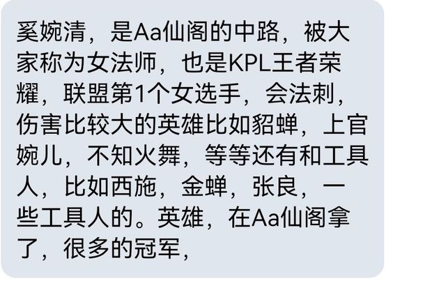 陶傳凱,(初晨,)奚婉清,是Aa仙閣的中路,被大家稱為女法師,也是KPL王者榮耀,聯(lián)盟第1個(gè)女選手,會(huì)法刺,傷害比較大的英雄比如貂蟬,上官婉兒,不知火舞,等等還有和工具人,比如西施,金蟬,張良,一些工具人的。英雄,在Aa仙閣拿了,很多的冠軍,