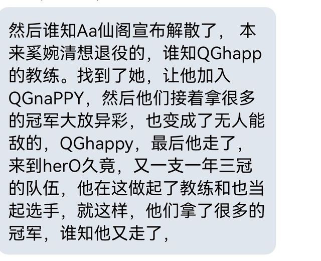 陶傳凱,(初晨,)然后誰知Aa仙閣宣布解散了, 本來奚婉清想退役的,誰知QGhapp的教練。找到了她,讓他加入QGnaPPY,然后他們接著拿很多的冠軍大放異彩,也變成了無人能敵的,QGhappy,最后他走了,來到herO久竟,又一支一年三冠的隊(duì)伍,他在這做起了教練和也當(dāng)起選手,就這樣,他們拿了很多的冠軍,誰知他又走了,