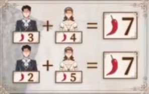 :想要找到最辣的巧克力,就要看各位對應(yīng)的調(diào)料情況,如果搭檔兩人的調(diào)料都是辣椒,那么辣度就會相加。如果搭檔兩人的調(diào)料,一個是辣椒另一個是別的口味,那么辣度只算單個辣椒的濃度。如果有辣度相同的情況,那么看組合里辣度最高的數(shù)字是幾,單個數(shù)字最大的辣度更高