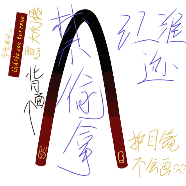 不一會(huì)兒,雨向帶土展示了發(fā)帶,紅色布的尾部縫著一只金色小兔子頭,異常顯眼,背后寫著一串不知名符號(hào)。