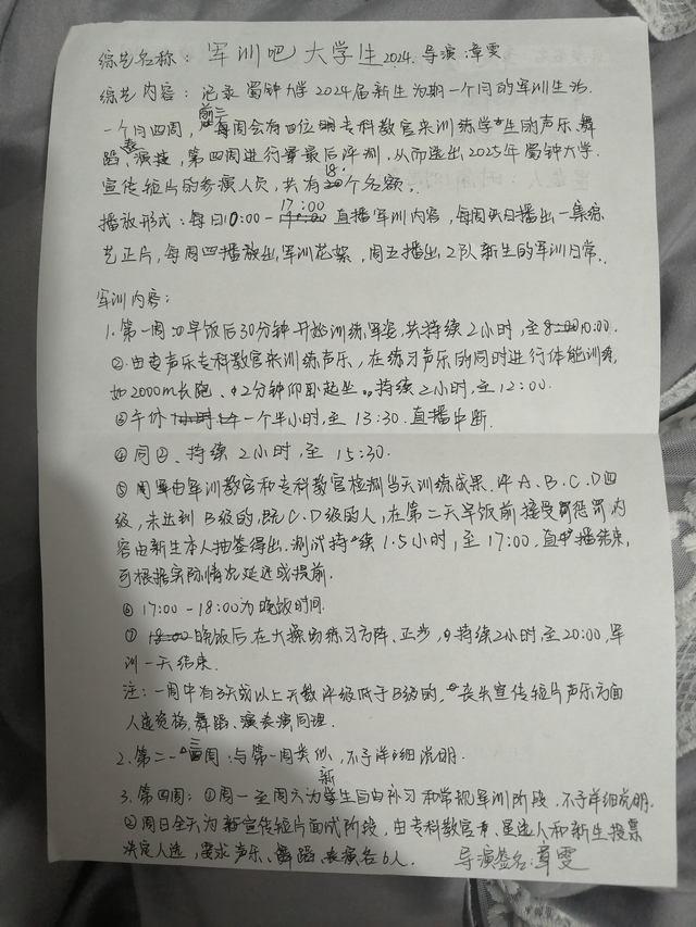 章雯全體新生注意!我是章雯,是蜀鐘大學(xué)現(xiàn)任校長兼《軍訓(xùn)吧,大學(xué)生2024》的總導(dǎo)演。我相信你們中應(yīng)該有一些人聽過我的名字或是《軍訓(xùn)吧,大學(xué)生》這檔節(jié)目。作為蜀鐘大學(xué)的學(xué)生,你們的軍訓(xùn)內(nèi)容肯定沒有那么簡單!可能有人看過往期節(jié)目,那就應(yīng)該知道,《軍訓(xùn)吧,大學(xué)生》的作用主要是兩個(gè):一是為想日后在娛樂圈中混出點(diǎn)名堂的人提供一個(gè)機(jī)會(huì),二是為蜀鐘大學(xué)的下一屆招生錄制宣傳短片。那么現(xiàn)在,請各位教官分發(fā)總歸策劃書!