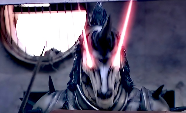 魔馬獸向鐵架上的東杉發(fā)射紅色激光,激光連成一線。
