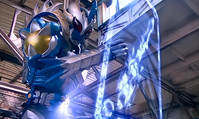 東杉瞬移躲過(guò)魔馬獸的攻勢(shì),轉(zhuǎn)身轉(zhuǎn)動(dòng)乾坤腰帶的右轉(zhuǎn)輪,召喚出——風(fēng)鷹劍。