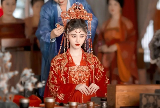 眾人期盼已久的日子終于到來。陸婉月洗漱完畢后,由四五名丫鬟精心為她換上了華美的嫁衣。隨后,她們小心翼翼地將她扶至銅鏡前。待這幾名丫鬟退下后,又有兩名丫鬟上前,手持胭脂與口脂,細致入微地為陸婉月梳妝描眉,力求將她裝扮得更加完美無瑕。