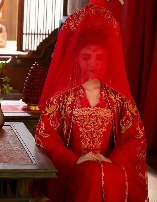 宋墨一腳跨進新房門檻,目光立即被吸引至榻上。那里,陸婉月身著一襲火紅嫁衣,端坐如蓮,頭上的紅綢蓋頭更添幾分神秘與莊重。
