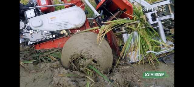 陳少熙艱難的推著割稻機(jī)走著憋的滿臉通紅