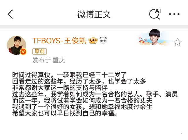 王俊凱:時(shí)間過(guò)得真快,一轉(zhuǎn)眼我已經(jīng)三十二歲了?;乜醋哌^(guò)的這些年,經(jīng)歷了太多,也學(xué)會(huì)了太多。非常感謝大家這一路的支持與陪伴。過(guò)去這些年,我學(xué)著如何成為一名合格的藝人、歌手、演員。而這一年,我將試著學(xué)會(huì)如何成為一名合格的丈夫。我遇到了一個(gè)很好的女孩,想和她幸福地度過(guò)余生。希望大家也可以早日找到自己的幸福。
