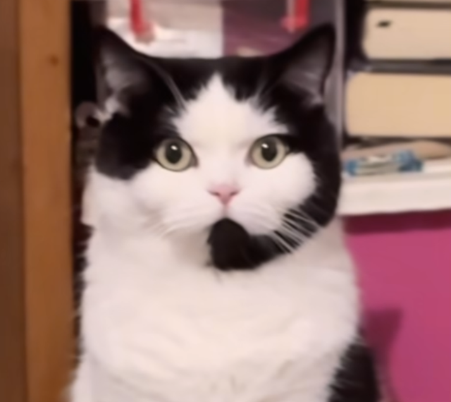 奶牛貓全身只有黑白兩色,嘴巴上的黑毛非常別致的彎曲成一個話筒,看著像客服嘴邊的話筒耳麥。