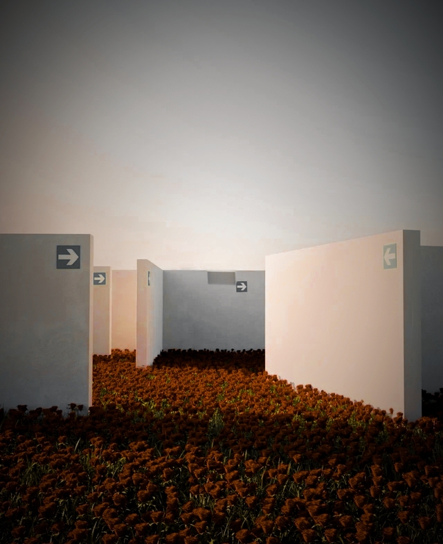 ??翻過一個(gè)小山丘,多多站在高處遠(yuǎn)遠(yuǎn)望去,發(fā)現(xiàn)不遠(yuǎn)處有一棟由貼圖構(gòu)成的小房子孤零零地佇立在草原上的低洼處,那里一定是個(gè)突破口!這么想著,多多撒開丫子往小屋的方向跑去,但還沒等他跑出幾步,腳底忽然一空,整個(gè)人瞬間陷進(jìn)了草地里,隨后竟然又從草地平穩(wěn)地掉到了一張課桌前。