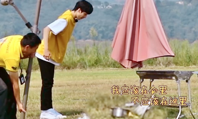 嚴浩翔在一旁幫忙扶著傘骨,兩人配合著,試圖與這笨重的家伙建立良好關系。