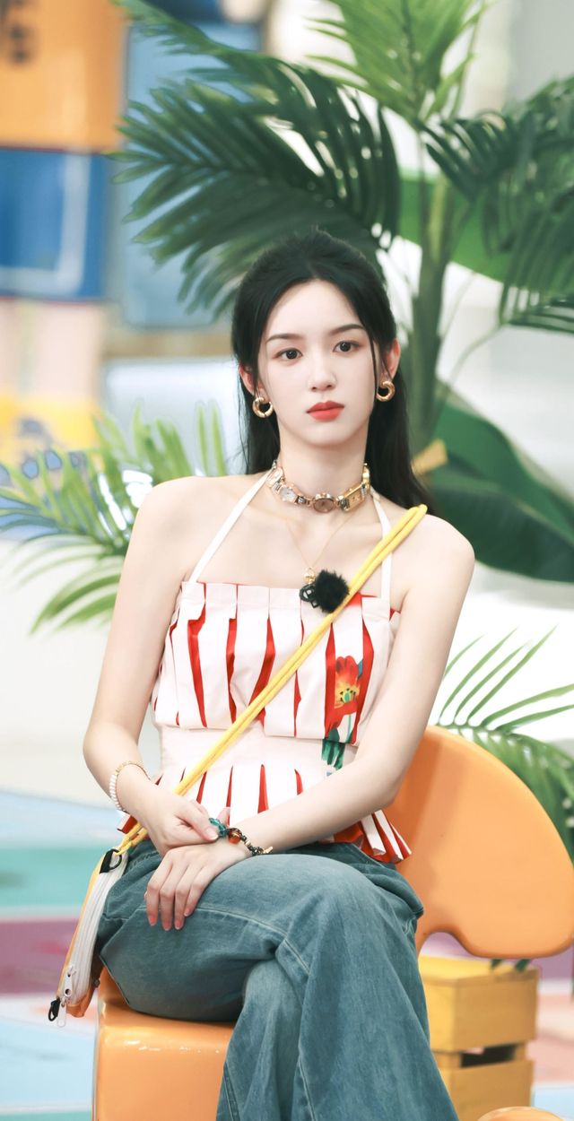 不得不說阮沐芊今天的look確實很美,上身一個白色吊帶花朵點綴,配一條牛仔長褲,拉著粉嫩的行李箱,背著小包