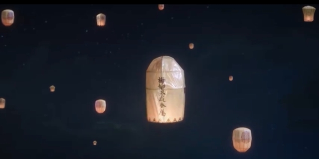 露蕪衣和梅逐雨面對面立著,同時埋頭在中間的那盞素白竹骨天燈上細(xì)細(xì)寫下自己的心意,燈芯的暖黃晃出細(xì)碎的光影。