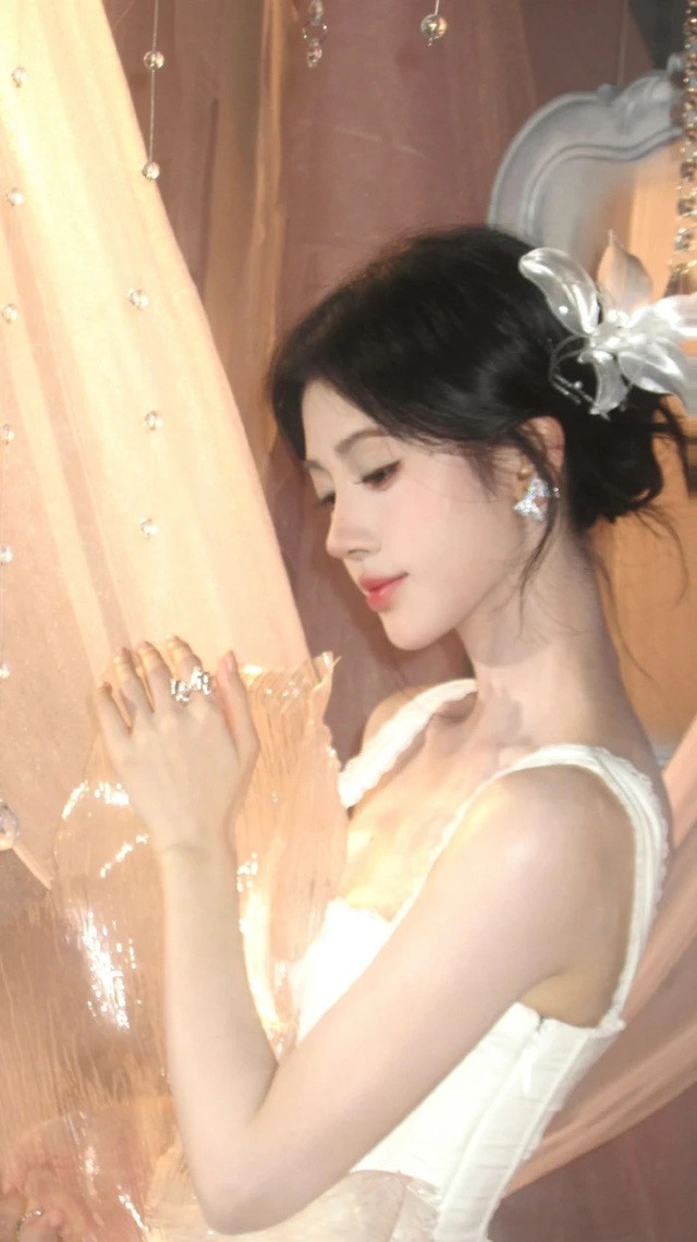 女孩一襲淺白色拖地禮服款式新穎大氣,完美地勾勒出她盈盈一握的纖細(xì)腰身,露出來的脖頸白皙修長,禮服顏色更襯得她的皮膚雪白。