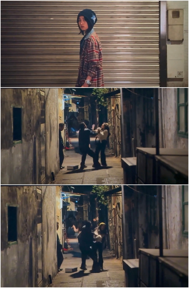 何秋果(快步走進(jìn)小巷,對著強(qiáng)迫女生的兩人厲聲警示道):喂!放開她們,站在一邊!