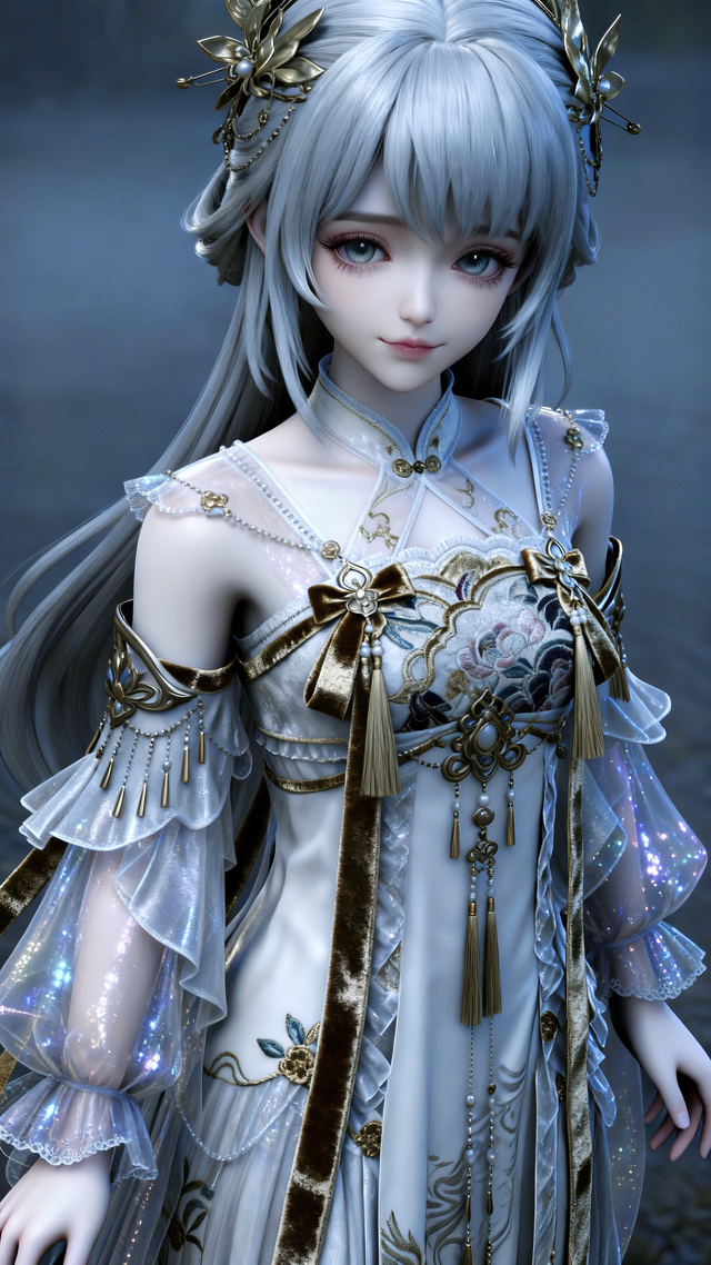 只見那女孩有著一頭灰色的長發(fā),身著白金色的露肩連衣短裙,裙子上有著金色紋理裝飾,頭上帶著金色的發(fā)飾,像是某家出來游玩的千金小姐一般。