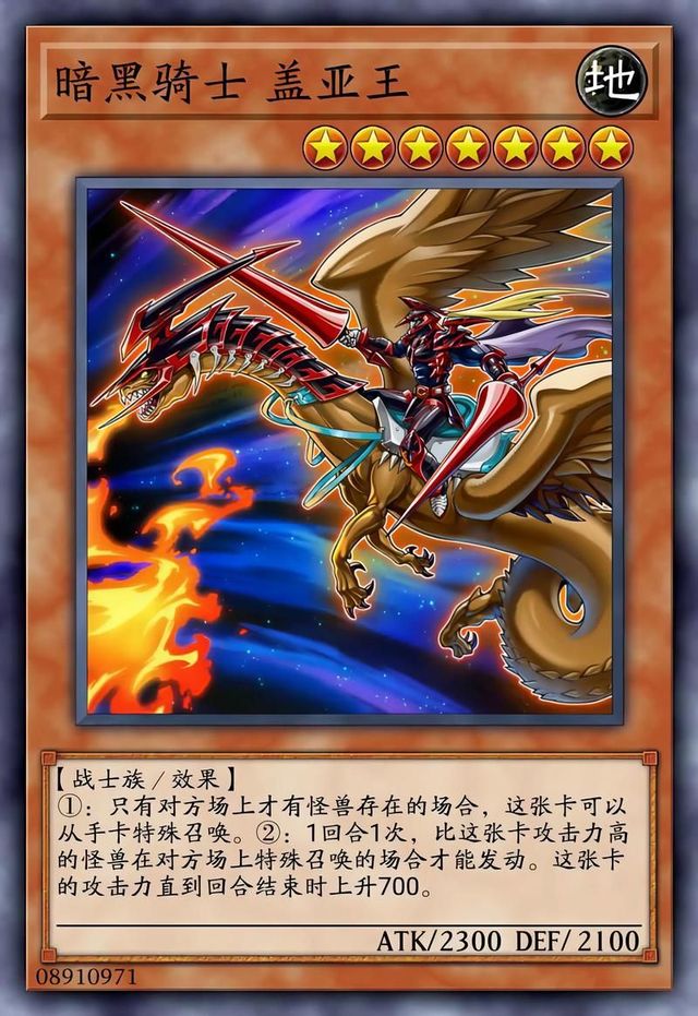 卡片介紹:【卡片名字:暗黑騎士 蓋亞王】【屬性:地】【等級(jí):7】【種族:戰(zhàn)士族】【卡片種類:效果怪獸】【攻擊力:2300】【守備力:2100】【效果:①只有對(duì)方場(chǎng)上才有怪獸存在的場(chǎng)合,這張卡可以從手卡特殊召喚。②1回合1次,比這張卡攻擊力高的怪獸在對(duì)方場(chǎng)上特殊召喚的場(chǎng)合才能發(fā)動(dòng)。這張卡的攻擊力直到回合結(jié)束時(shí)上升700】