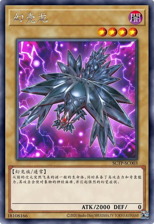 卡片介紹:【卡片名字:幻殼龍】【屬性:暗】【等級(jí):4】【種族:幻龍族】【卡片種類:通常怪獸】【攻擊力:2000】【守備力:0】