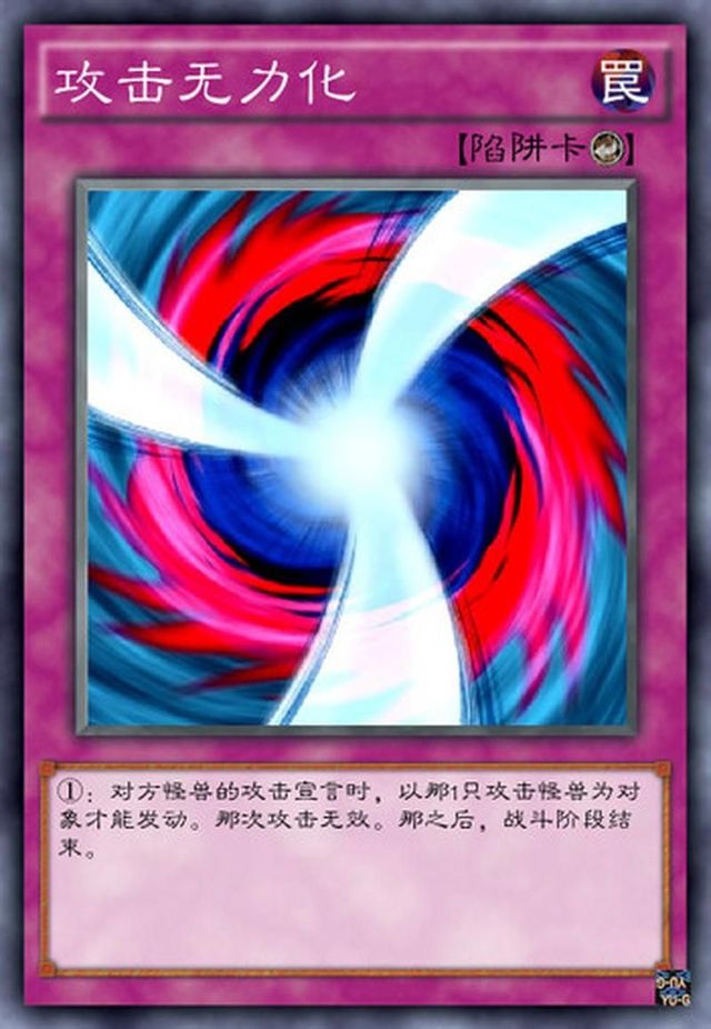 卡片介紹:【卡片名字:攻擊無(wú)力化】【卡片種類:反擊陷阱卡】【效果:對(duì)方怪獸的攻擊宣言時(shí),以那1只攻擊怪獸為對(duì)象才能發(fā)動(dòng)。那次攻擊無(wú)效。那之后,戰(zhàn)斗階段結(jié)束】