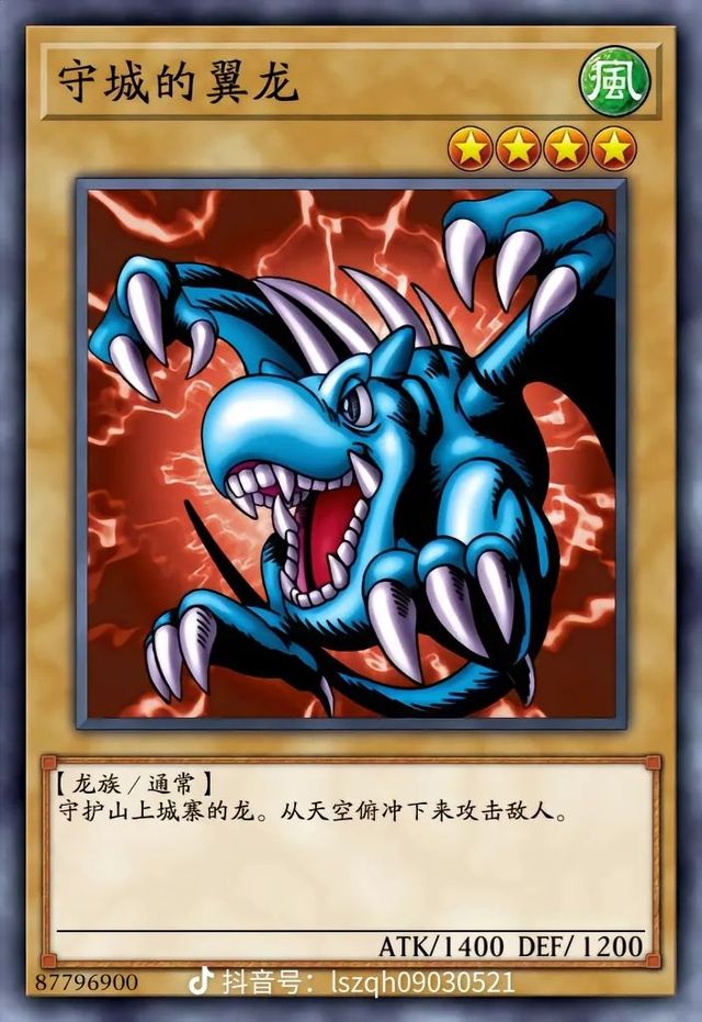 卡片介紹:【卡片名字:守城的翼龍】【屬性:風(fēng)】【等級:4】【種族:龍族】【卡片種類:通常怪獸】【攻擊力:1400】【守備力:1200】