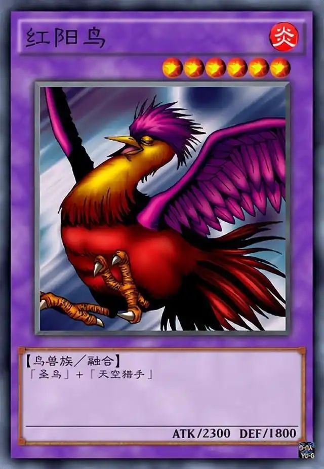 卡片介紹:【卡片名字:紅陽鳥】【屬性:炎】【等級:6】【種族:鳥獸族】【卡片種類:融合怪獸】【攻擊力:2300】【守備力:1800】【融合素材:圣鳥+天空獵手】