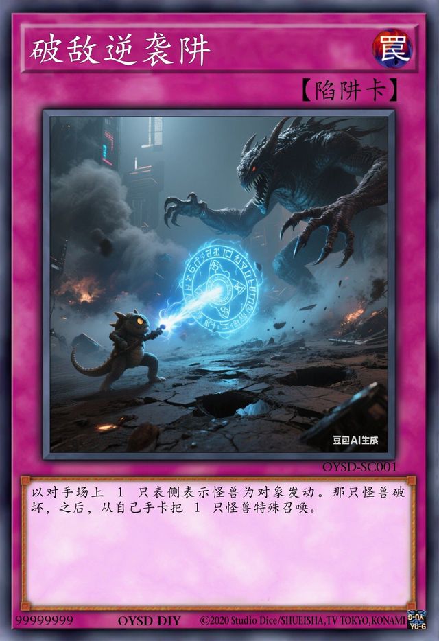 卡片介紹:【卡片名字:破敵逆襲阱】【卡片種類:通常陷阱卡】【效果:以對手場上1只表側(cè)表示怪獸為對象發(fā)動。那只怪獸破壞,之后,從自己手卡把1只怪獸特殊召喚】