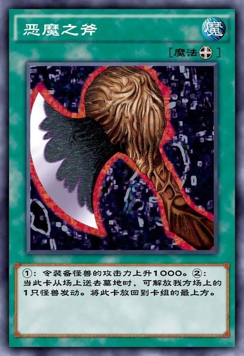 卡片介紹:【卡片名字:惡魔之斧】【卡片種類:裝備魔法卡】【效果:①令裝備怪獸的攻擊力上升1000。②當(dāng)此卡從場上送去墓地時(shí),可解放我方場上的1只怪獸發(fā)動。將此卡放回到卡組的最上方】
