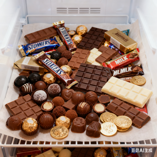 小辛拎著購(gòu)物袋,一股腦地把巧克力往里塞,黑巧克力、牛奶巧克力、夾著堅(jiān)果的混合巧克力,很快就把冷凍層填得滿滿當(dāng)當(dāng),連縫隙里都塞了幾小塊手工巧克力。