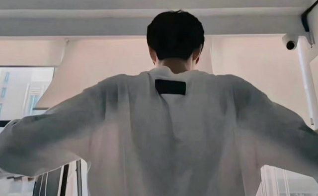 水流聲淅淅瀝瀝,他微微低著頭,側(cè)臉線條清晰而專注。圍裙的帶子勾勒出他寬厚挺拔的背脊,是常年鍛煉形成的流暢漂亮的倒三角。