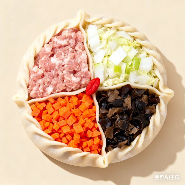 豬肉,白菜,木耳,胡蘿卜,四種餡料分為4個(gè)方位,輕捏出褶呈現(xiàn)花瓣的形態(tài),皮要韌,餡要干,因?yàn)檫@幾種菜都是含水量比較高的菜所以在做餡之前一定要擠干水分,否則在蒸的時(shí)候,容易因?yàn)樗诌^大而導(dǎo)致面皮松散破開