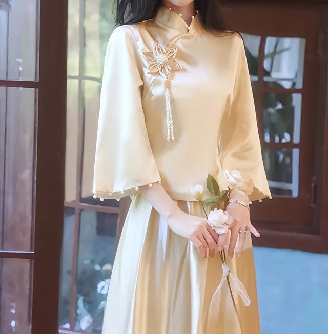 第一套是一襲中式的米黃錦緞長裙,胸口處一朵繁復(fù)花飾悄然綻放,層層疊疊的花瓣環(huán)繞著中央那顆瑩潤珍珠,花下垂掛的珍珠流蘇隨著步伐輕舞,為端莊中平添幾分靈動。