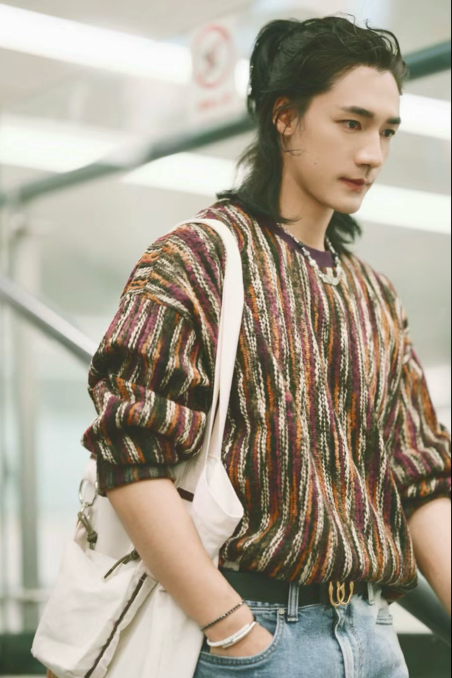 上身是一件色彩斑斕的條紋毛衣,紫色、橙色、綠色和黑色交織出如同秋日調(diào)色盤般的絢爛,條紋元素讓他的身形在視覺上更具立體感,厚實(shí)的毛衣質(zhì)地讓他在夜里也不會(huì)感覺冷。下身搭配一條淺藍(lán)色牛仔褲,寬松版型勾勒出閑適輪廓,與黑色皮帶上的金色金屬扣形成點(diǎn)睛之筆,精致而不張揚(yáng)。給人的感覺就是簡(jiǎn)約、休閑。