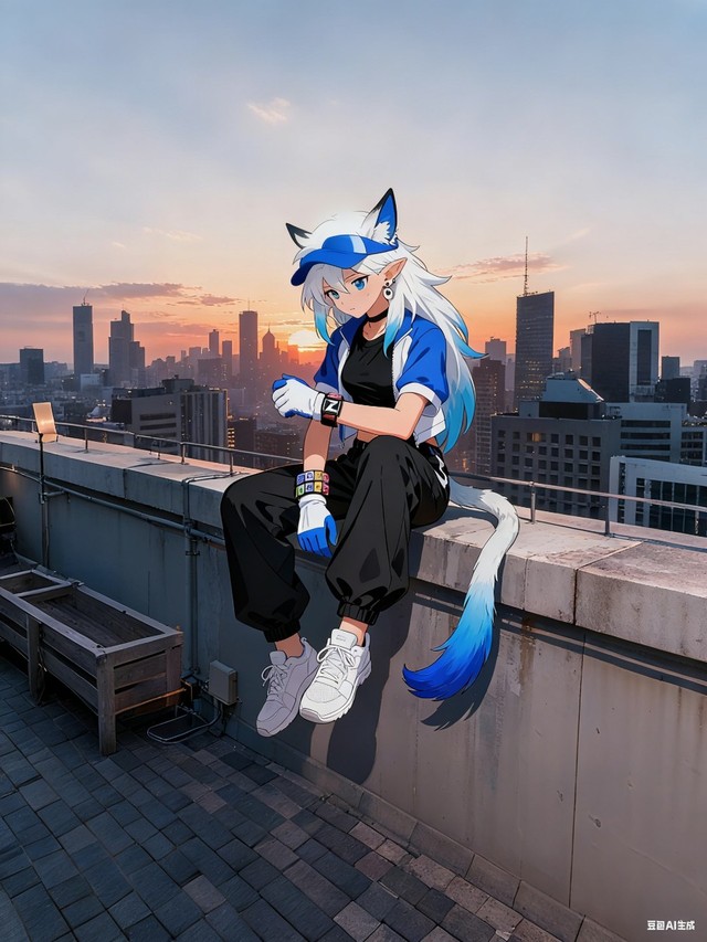 發(fā)型:較長的白色狼尾發(fā),發(fā)尾為漸變藍色,頭頂帶有呆毛;