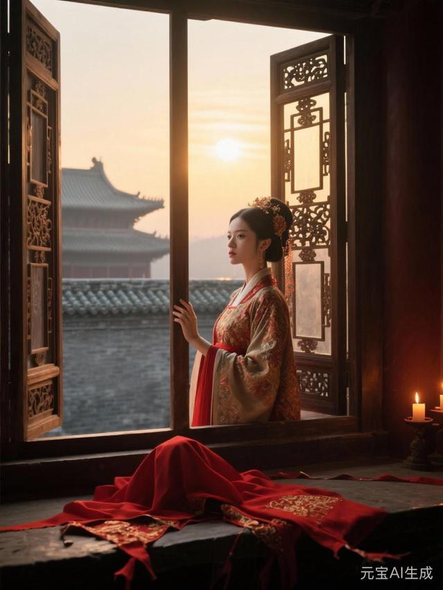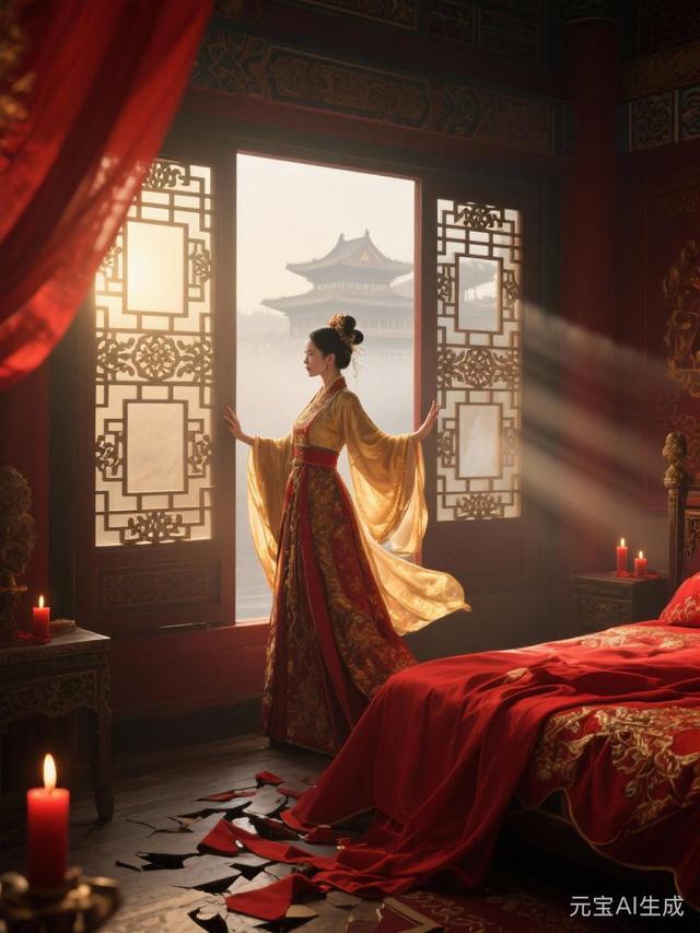 熹微的晨光,終于像個怕迷路的膽小鬼,畏畏縮縮地從雕花窗欞縫隙里探進來一絲。殿內(nèi)奢華的紅,被這慘淡的光一照,莫名顯出幾分紙扎鋪子般的虛幻和凄涼。