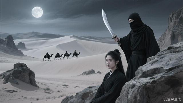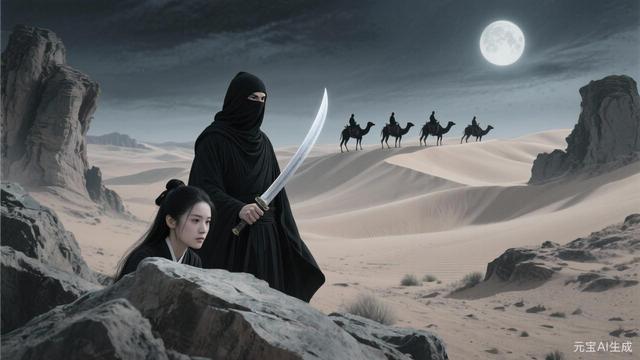 月光下,一隊(duì)騎著駱駝的黑衣人出現(xiàn)在沙丘之上,他們穿著黑色的僧袍,臉上蒙著黑布,只露出一雙雙冰冷的眼睛,正是墨守者的人。為首的是一個(gè)身材高大的黑衣人,他騎著一匹黑色的駱駝,手中拿著一把長(zhǎng)長(zhǎng)的彎刀,刀身閃爍著寒光,正是之前在黃河渡口追殺他們的墨守者首領(lǐng)。