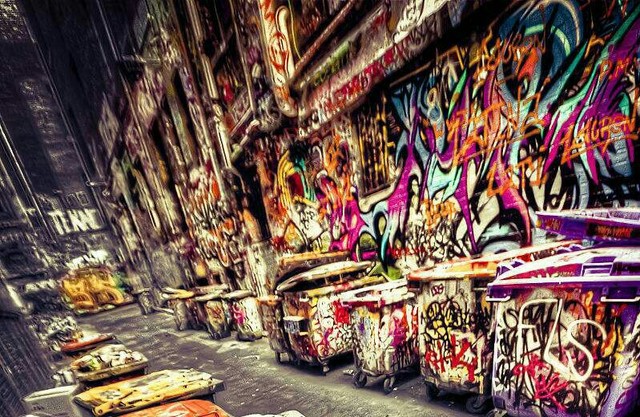 不知不覺兩人漫步走到了一個(gè)充滿涂鴉的街道。整個(gè)街道充滿了涂鴉,五彩繽紛。