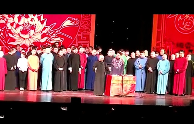 等到郭德綱和于謙壓軸出場后,大家伙圍著二位角兒成一個半月型,似眾星拱月。