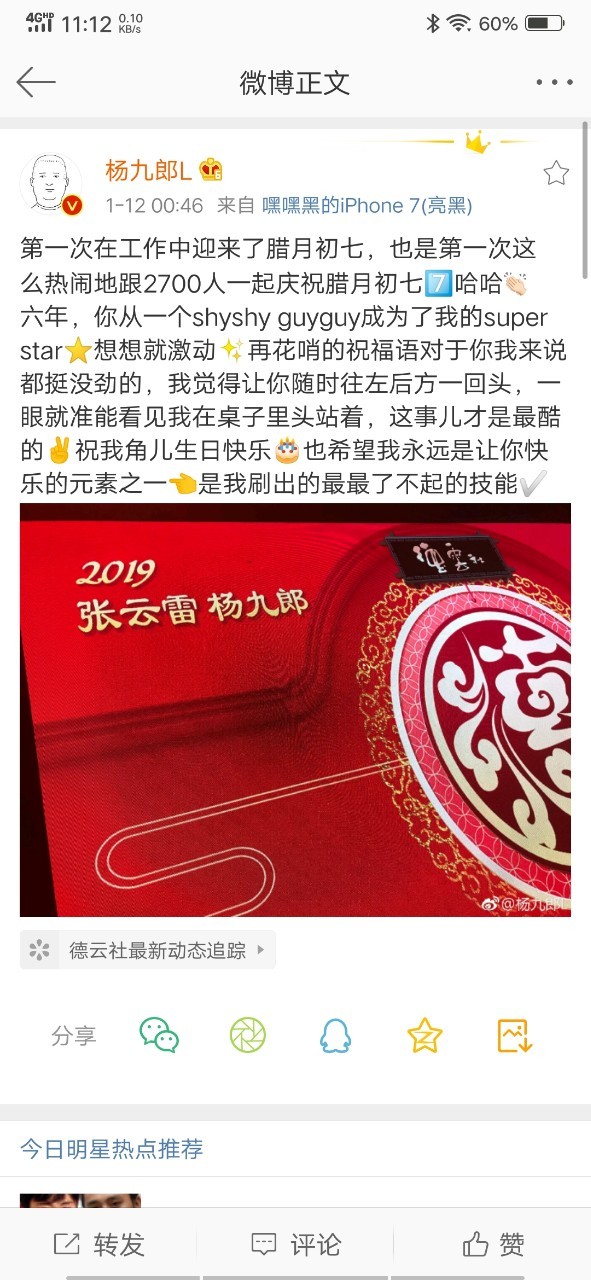 眾人都坐下開始吃飯,九郎拿起手機(jī)發(fā)了條微博。