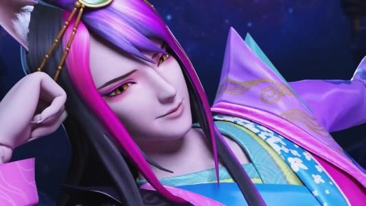 【墨白】的形態(tài)則是顏爵褪去色彩后的狀態(tài)。除了面妝和耳朵有變化,服裝樣式不變。褪色后的顏爵僅留金色和墨白三種顏色,如一副墨畫未被染上色彩一般。服裝從上到下黑漸變白色,頭發(fā)烏黑,粉毛直立三角形的小狐耳變成一對灰毛側(cè)立大狐耳,眉尾上挑,橢圓琥珀金瞳眼也變成了深色紫眸。