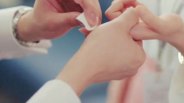 蔡徐坤買完藥,走到林宸歡身邊,小心翼翼地解開手帕,用碘伏替她消毒。