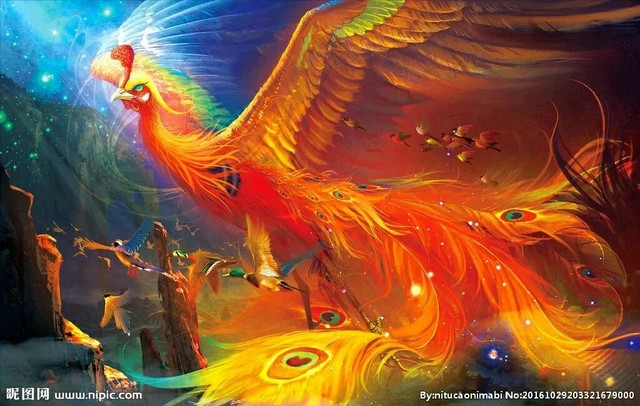 火鳳振翅而飛在天空留下無數(shù)金黃的顏色