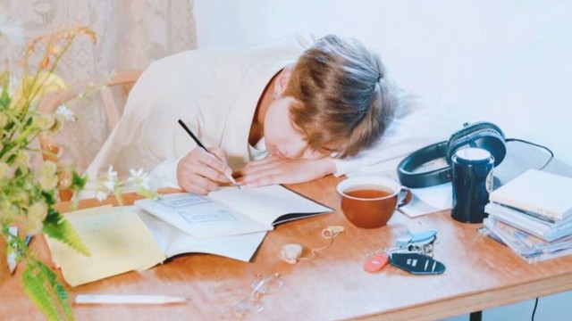 金南俊被同桌給喊醒了,用手揉了揉眼睛,睡眼惺忪地看著放在自己桌上的東西。