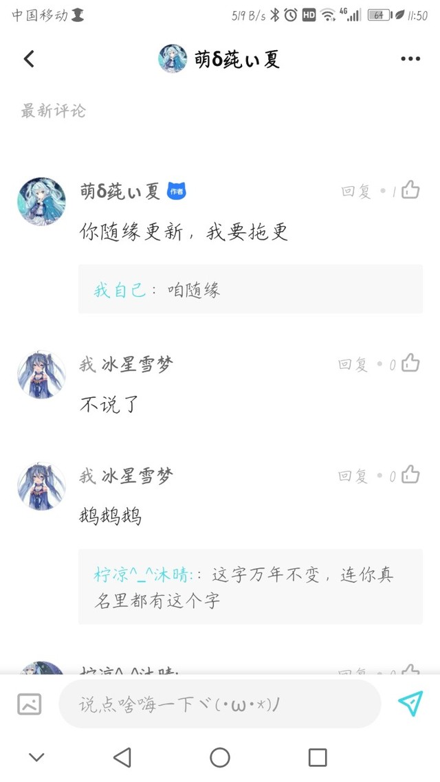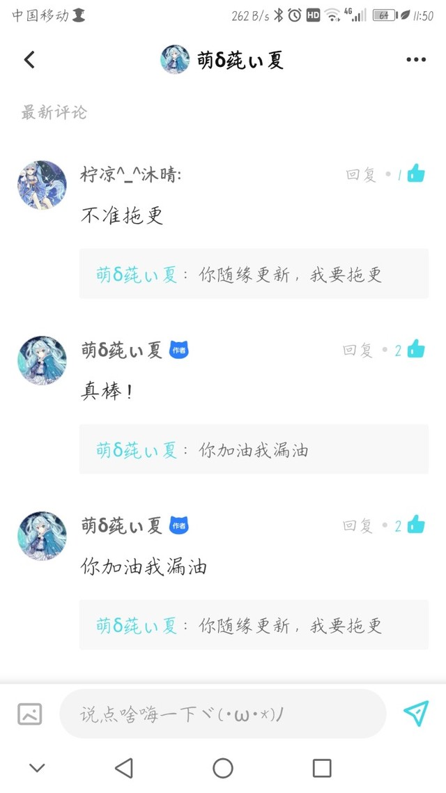 冰星雪夢(mèng)最近又從快點(diǎn)的萌δ莼ぃ夏學(xué)到了,新的拖更方法!新書她的文不發(fā),我也不更!???(?╯︶╰??)現(xiàn)學(xué)現(xiàn)賣,真好?。ㄎ矣浀蒙匣乜此謾C(jī)好像還沒(méi)提交審核!大家一起去轟炸她的私信,加油!『沒(méi)事,她懶惰癥晚期,催也不一定會(huì)更!』)