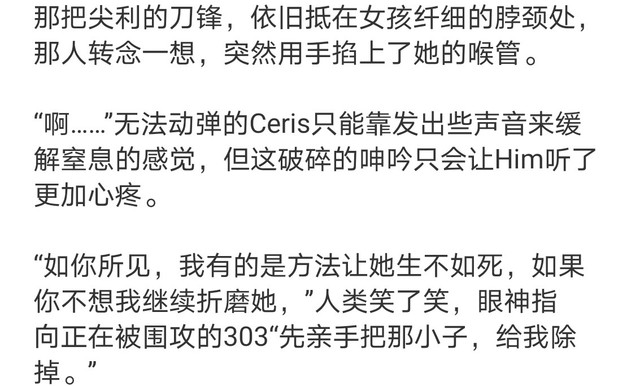 “哦?”人類手中的武器又逼得更近了些,Ceris面色蒼白,一口氣有進沒出的,看得Him巴不得自己替了她。