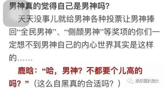 問(wèn):對(duì)于小鮮肉、男神這樣的稱號(hào)你怎么看? 鹿:男神稱不上,男神要腿長(zhǎng)的,我腿不長(zhǎng)。