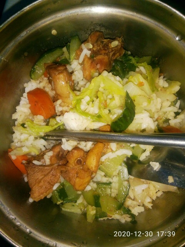 米飯,雞肉炒胡蘿卜,黃瓜,白菜